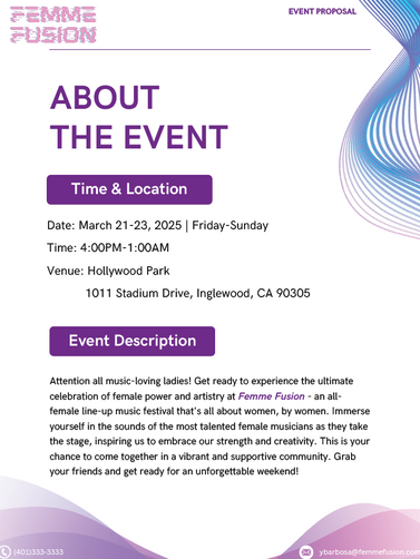 For my Concert Production Course, I was assigned to compose a hypothetical event proposal. I conceptualized an all-female lineup music festival, called Femme Fusion. This innovative proposal embodies my vision for empowering female artists and celebrating their talents on a grand stage. Snippets of this project reflects my passion for creativity, diversity, and forward-thinking event management. Below you will find snippets of the proposal.